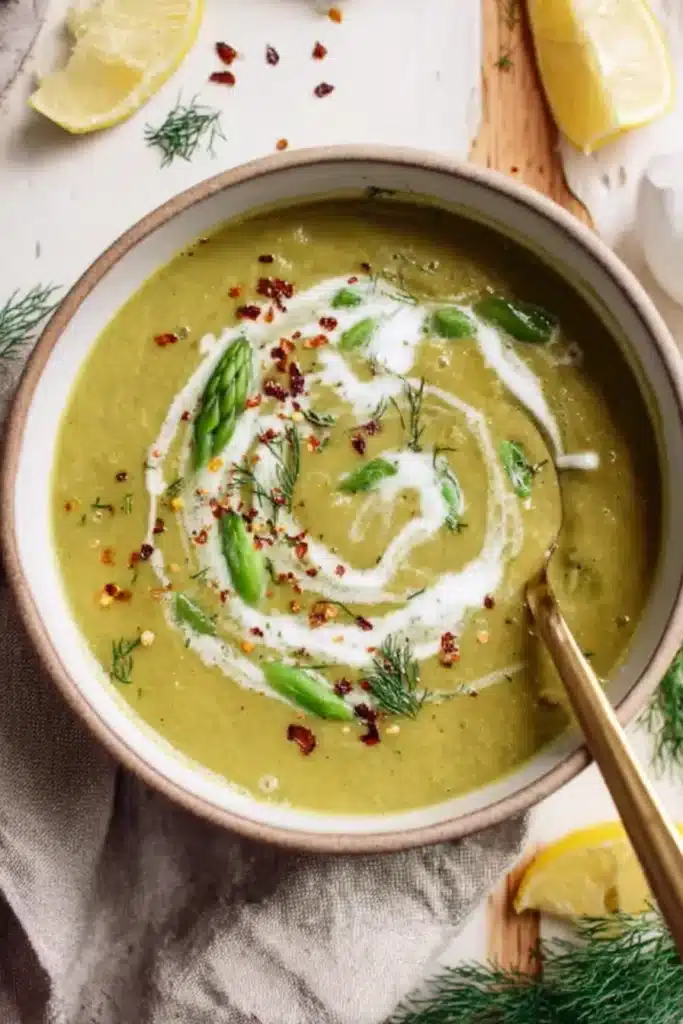 This soup has a smooth, velvety feel and a naturally sweet, earthy taste from fresh asparagus. Dill brings light herbal notes, while lemon adds just enough zing. A drizzle of coconut milk or cream on top creates a pretty swirl, and fresh dill leaves make it extra inviting. Serve it with crusty bread, crackers, or a green salad for a balanced meal. For extra comfort, pair it with a warm sandwich on a cool evening.