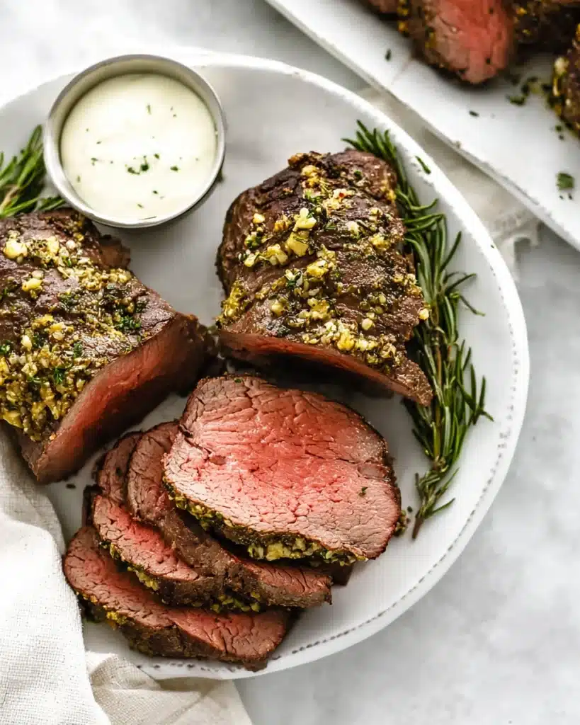 The butter, herbs, and garlic create a rich, flavorful crust that locks in the beef’s juices and aroma. The avocado oil helps develop a beautiful golden sear without smoking. Prep time is quick, and the total cook time, including searing and roasting, takes about half an hour, making this dish perfect for a weeknight dinner or an elegant Christmas feast.