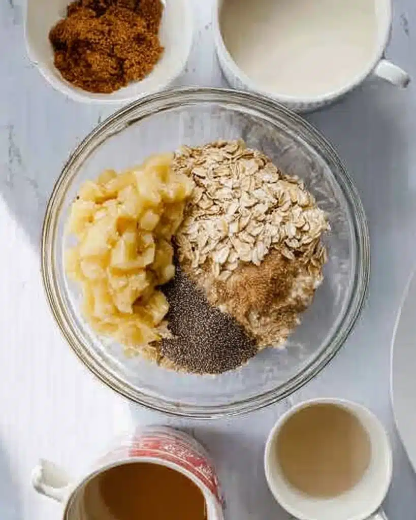 Rolled oats are the base and give these overnight oats their hearty texture. Chia seeds thicken the mixture naturally and add fiber and omega-3s. Brown sugar adds that deep, caramel-like sweetness. Mashed ripe bananas bring natural sugar and smooth creaminess. Vanilla extract and cinnamon enhance the flavor with warmth and depth. A pinch of salt balances everything perfectly. Finish it off with milk or a plant-based option for a creamy consistency. You can also use water for a lighter version. Choose light or dark brown sugar depending on how rich you like your oats.