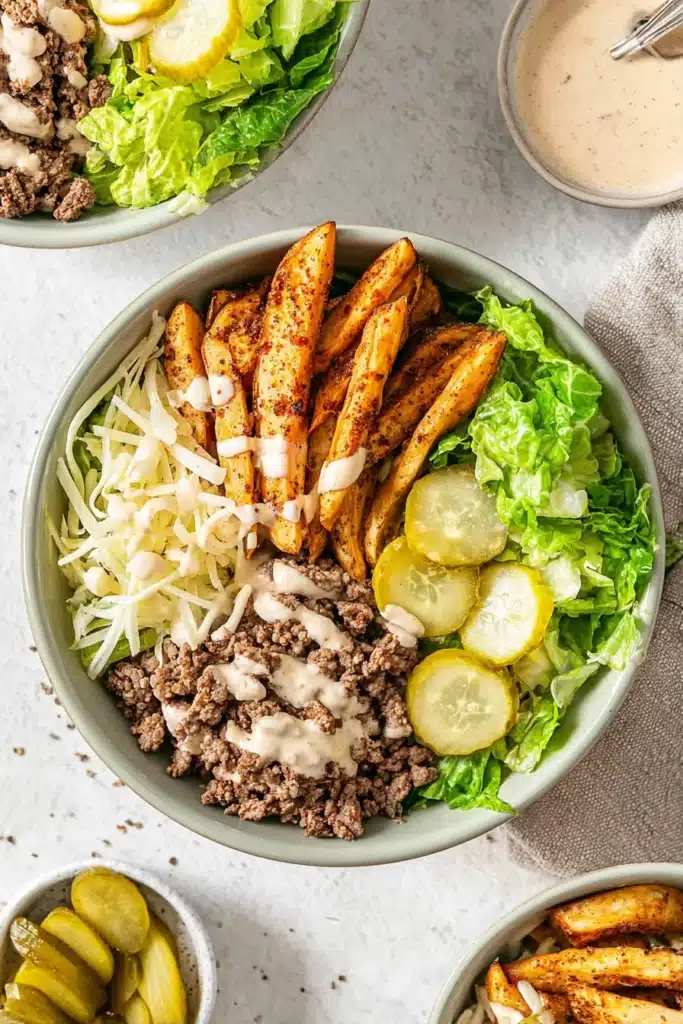 You still enjoy melty cheese, tangy pickles, and savory beef. However, everything sits neatly in a bowl, so it feels less messy and more filling.