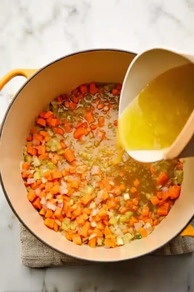 Start by heating olive oil in a soup pot over medium-high heat. Add celery, carrots, and onion. Cook for about 5โ7 minutes until soft and fragrant. Stir in minced garlic and cook one more minute.