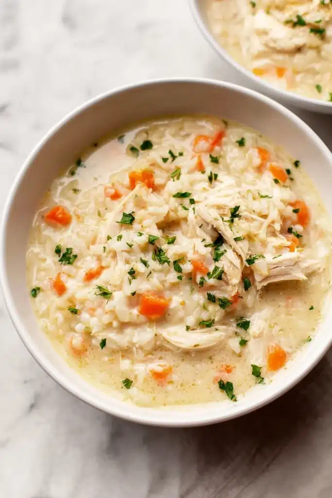 This creamy chicken and rice soup pairs wonderfully with crusty bread, garlic toast, or a light green salad. Add a sprinkle of Parmesan for extra richness. For dessert, try chocolate-covered strawberry cookies or sourdough red velvet cupcakes to end your meal sweetly.