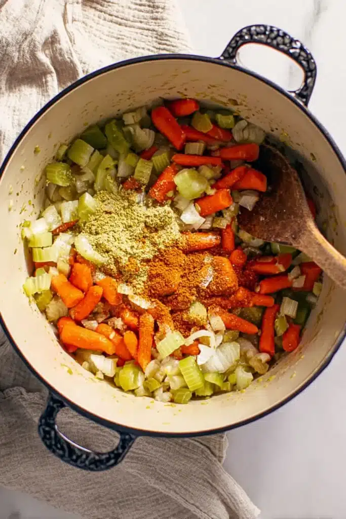 Start with olive oil to sautรฉ the base vegetables โ€” onion, carrot, and celery โ€” for a sweet, aromatic foundation. Add garlic for depth and a fragrant punch. Dried thyme, sage, and rosemary lend earthy, savory notes that make this soup taste like it simmered for hours.