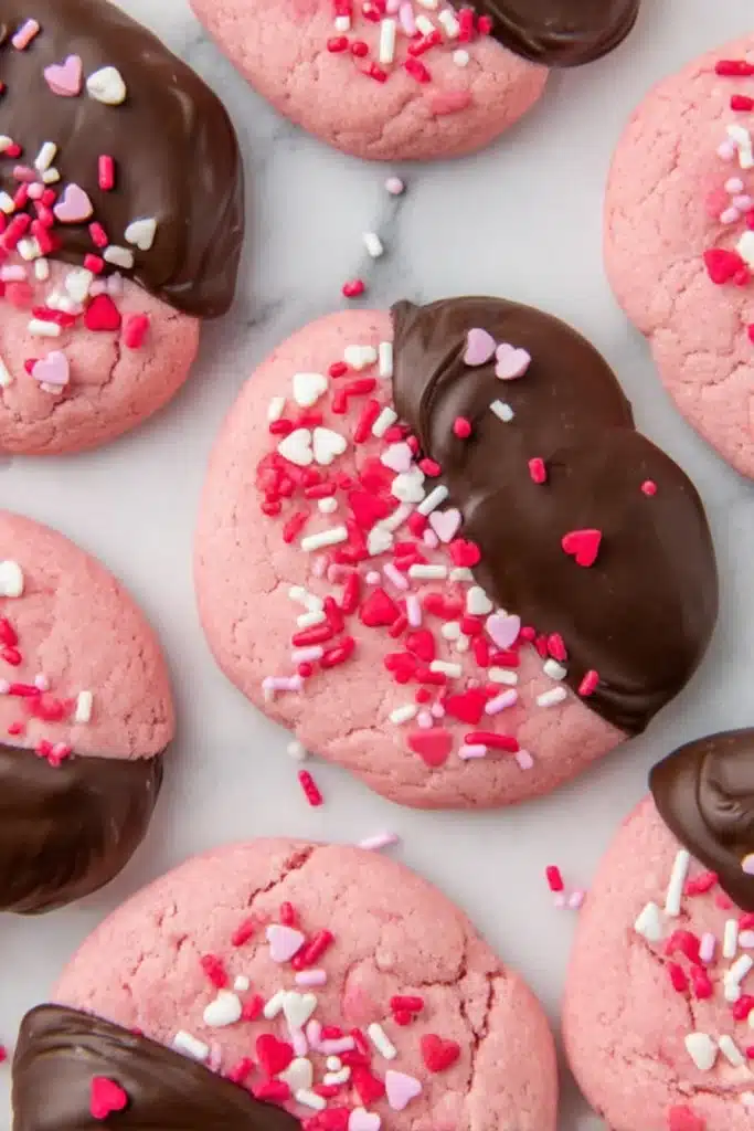Soft, pink, and dipped in rich chocolate, these easy Chocolate Covered Strawberry Cookies are the perfect Valentine’s Day treat — made with just 5 simple ingredients and ready in 30 minutes.