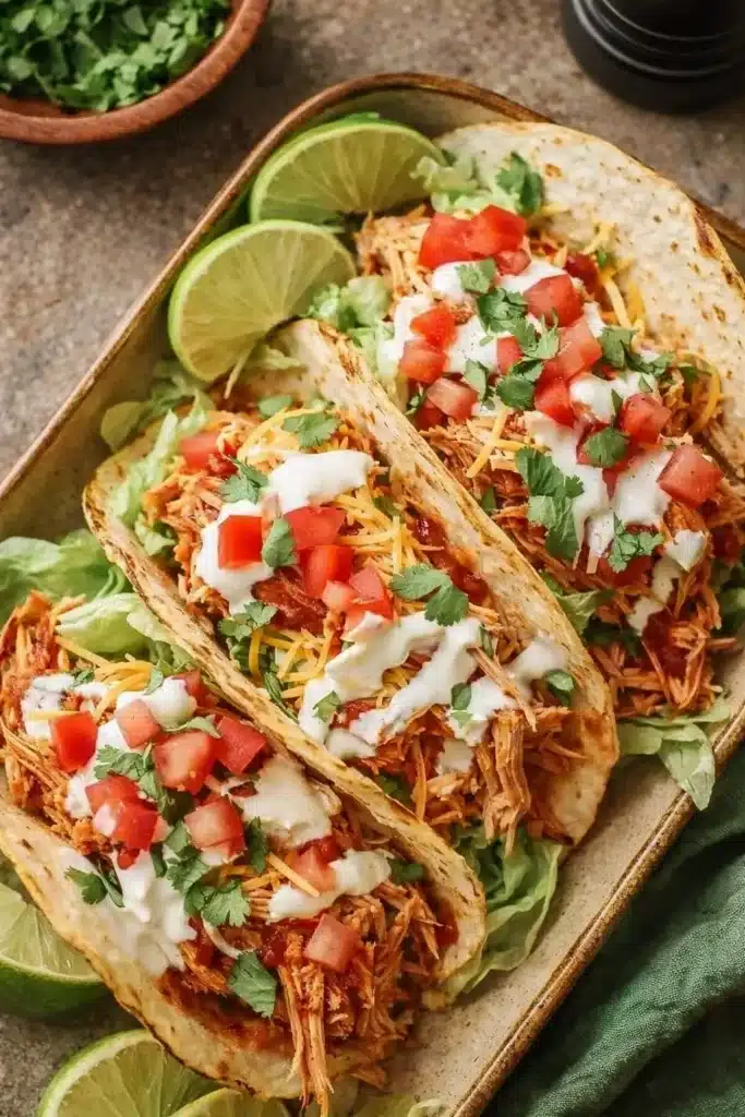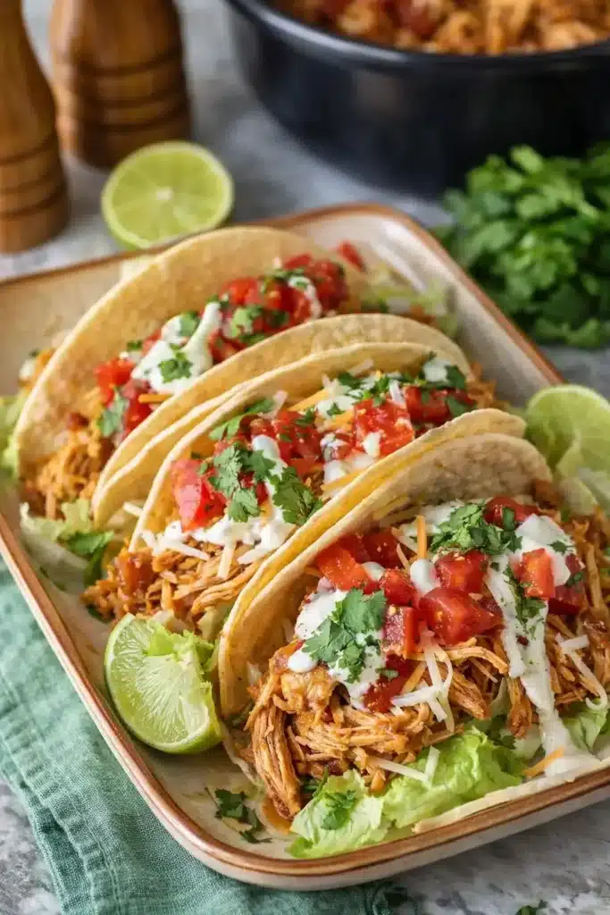 Spoon the shredded chicken onto soft tortillas and top with shredded cheese, lettuce, and sour cream. Add guacamole, cilantro, or a squeeze of lime for brightness. These tacos also work great in burrito bowls, nachos, or over rice. Serve with sides like Mexican corn, black beans, or a fresh tomato salad for a complete meal.