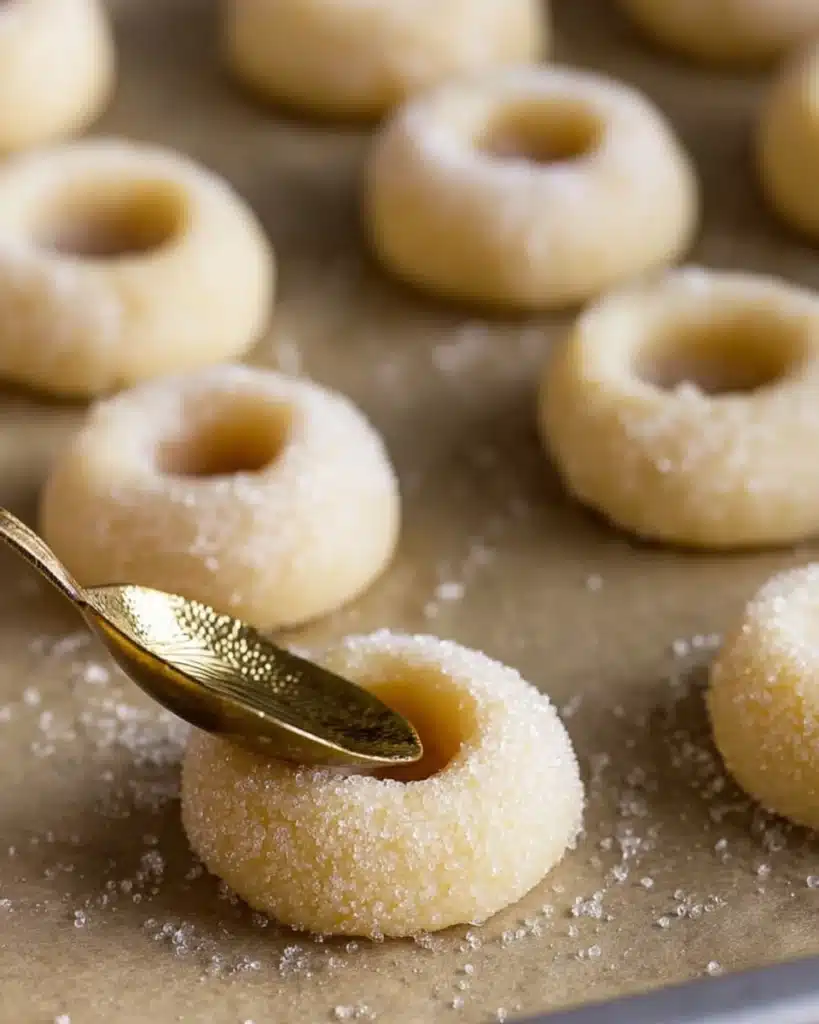 Scoop about one tablespoon of dough for each cookie and roll into smooth balls. If you like, roll them in sugar for a bit of sparkle. Press a small indent in the center using your thumb or the back of a teaspoon. Place the dough balls on a tray and freeze for 30 minutes to help them hold their shape while baking.