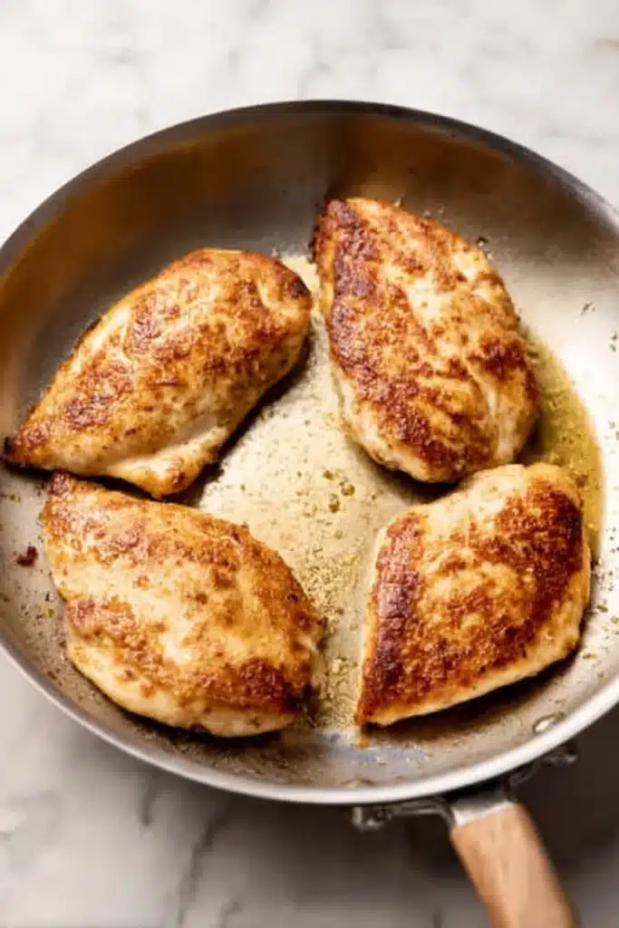 - Heat butter and olive oil in a skillet over medium-high heat. Add chicken and cook 4–5 minutes per side until golden brown. Remove and set aside.
