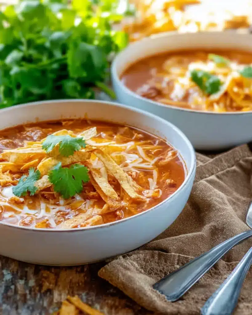 About 15 minutes before serving, remove the chicken and shred it using two forks. Then return it to the pot and stir well. Let it cook for another 15 minutes to soak up all the goodness. Finally, serve hot with shredded cheese and crispy tortilla strips. Add a sprinkle of cilantro, a slice of avocado, or a squeeze of lime for extra freshness.