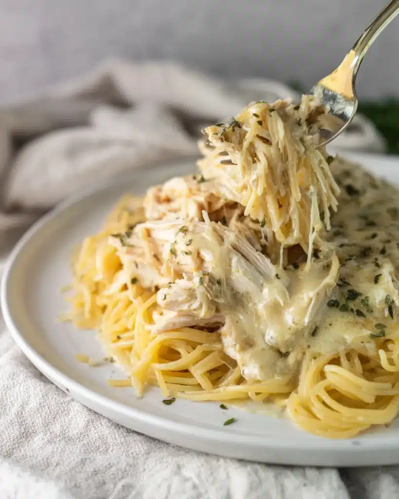 Try using boneless chicken thighs for more flavor or add sliced mushrooms and spinach in the last hour for extra texture. You can also switch up the pasta — fettuccine, penne, or egg noodles all work. Just avoid changing the ratios of soup, cream cheese, or butter, as that can affect the creamy consistency. For a slightly lighter version, reduce the butter to two tablespoons, but keep the cream cheese full-fat for smoothness.