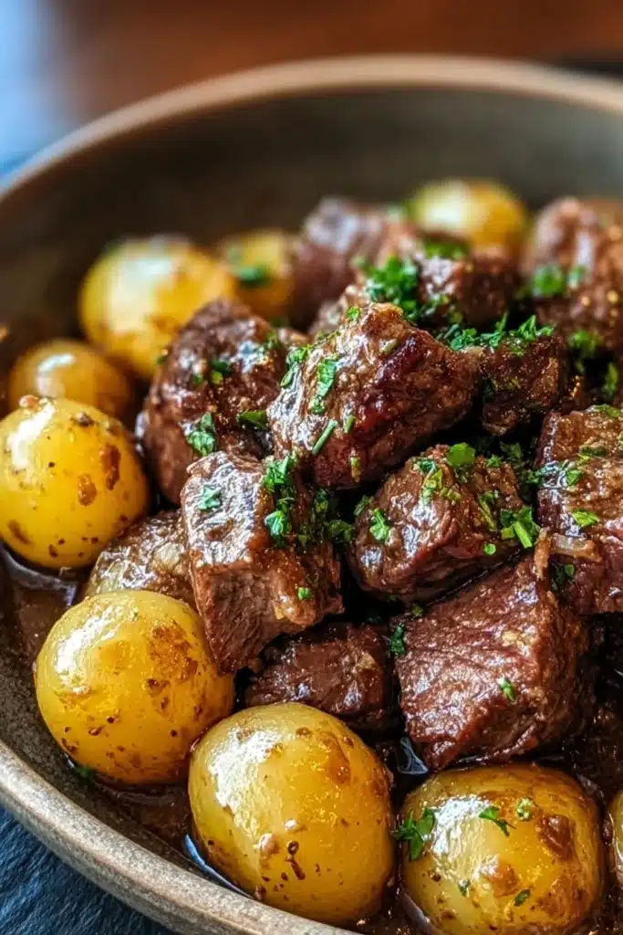 Use 1.5 pounds of beef stew meat, cut into bite-sized cubes, and about a pound of halved baby potatoes. The small, even cuts ensure even cooking. Potatoes absorb all the buttery garlic flavors, becoming tender and slightly crisp on the edges. You can also use other cuts like sirloin or chuck roast for variation.