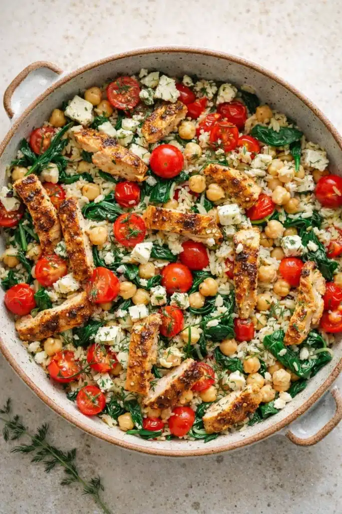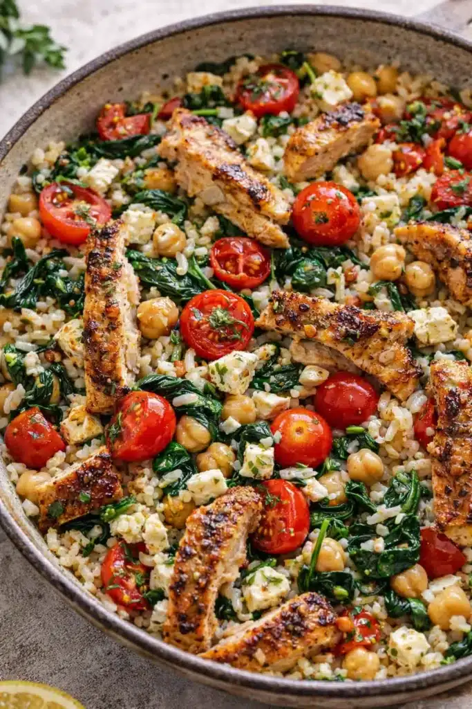 Bright, zesty, and bursting with Mediterranean flavor, this Greek Chicken and Lemon Rice makes a wholesome one-pan dinner youโll crave all week. Juicy chicken thighs, fluffy jasmine rice, chickpeas, and creamy feta create a comforting balance of freshness and heartiness. With spinach, tomatoes, and a squeeze of lemon in every bite, this skillet meal tastes like sunshine in a bowl. Itโs fast, healthy, and ready in just 30 minutesโperfect for busy weeknights or an easy weekend meal.