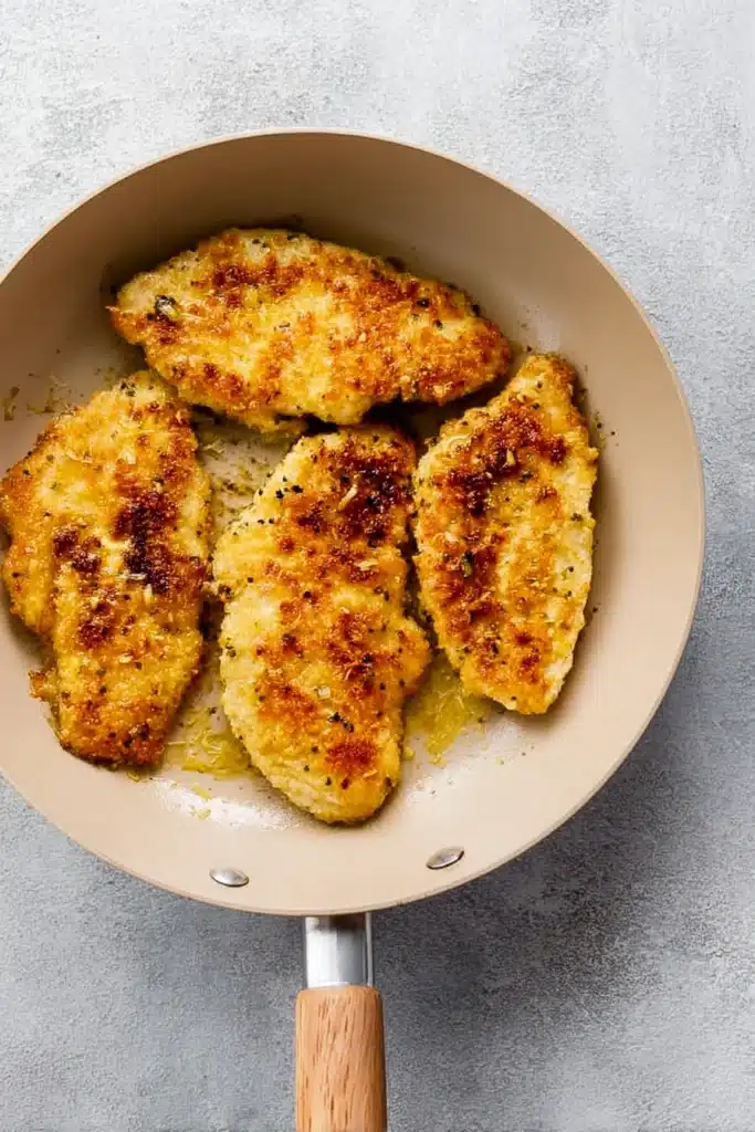 You’ll need 1½ pounds of chicken breast, two large eggs, minced garlic, Italian seasoning, salt, pepper, Parmesan cheese, and a bit of flour. The eggs and garlic mix together to make a rich coating base, while the Parmesan and flour create the crispy crust that turns golden brown in the pan.