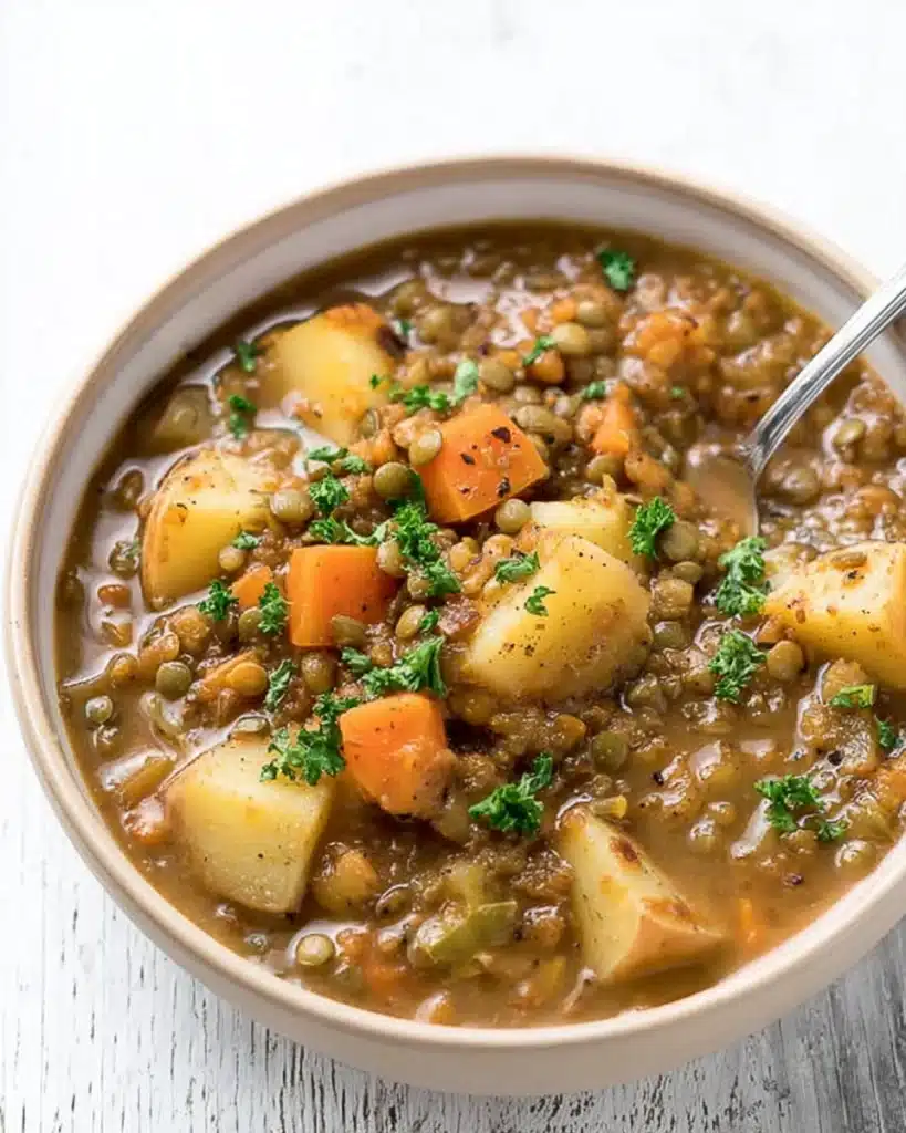 For a sweeter twist, try using half sweet potatoes and half regular ones. You can also add diced zucchini or bell pepper for extra color. A pinch of smoked paprika or cumin gives the soup a Mediterranean flavor that pairs perfectly with lentils.