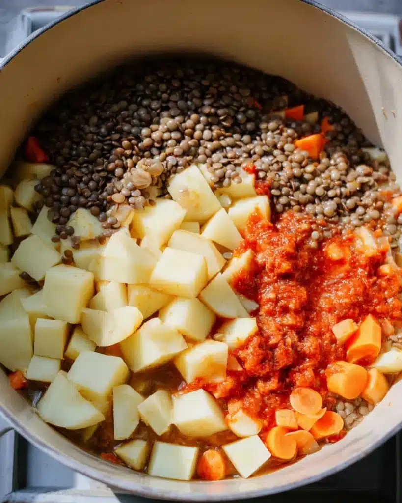 Pour in enough water or broth to cover everything by an inch. Bring the pot to a gentle boil, then reduce to a simmer. Let it cook for about 35 to 40 minutes until the lentils and potatoes are tender. Stir occasionally to prevent sticking. The soup will thicken naturally as it cooks.