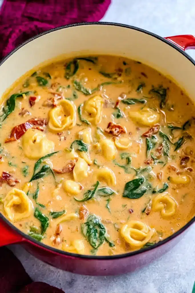 Creamy Marry Me Chicken Soup simmering in red pot with spinach and pasta