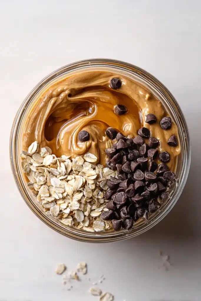 Start by mixing quick oats and mini chocolate chips in a medium bowl. Stir until evenly combined. If you’re adding chia seeds, flaxseed, or shredded coconut, toss them in now. This helps the dry ingredients coat everything and ensures a balanced mix later.