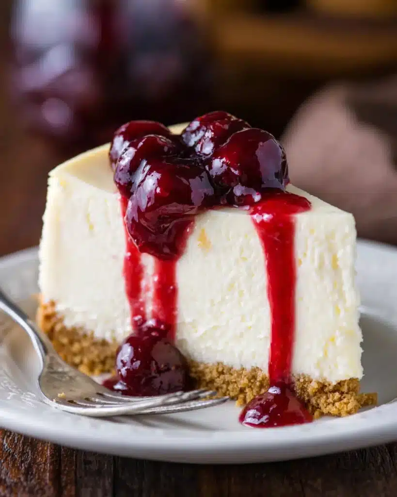 Cream cheese forms the base of this cheesecake. Use full-fat blocks for the smoothest texture. Sugar sweetens and helps create a silky finish, while eggs provide structure and richness. Sour cream adds a light tang, preventing the cheesecake from tasting overly heavy. Vanilla extract brings warmth and a comforting aroma that ties it all together.