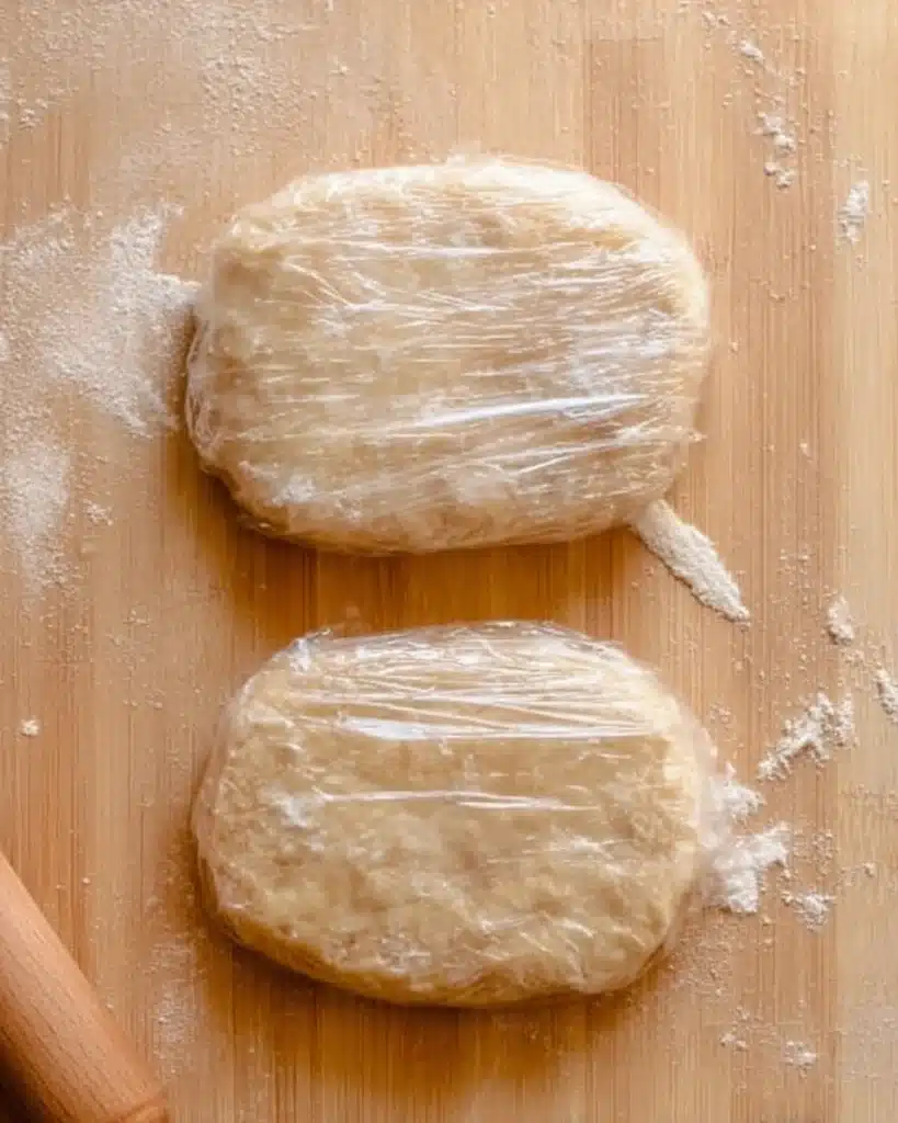 After the dough comes together, press it gently on a clean surface. Do not knead it because kneading activates gluten. Divide the dough into two equal pieces and flatten each into a disk. Wrap both disks tightly in plastic. Chill for one hour so the butter firms back up. This step helps the pie crust bake evenly and stay tender.
