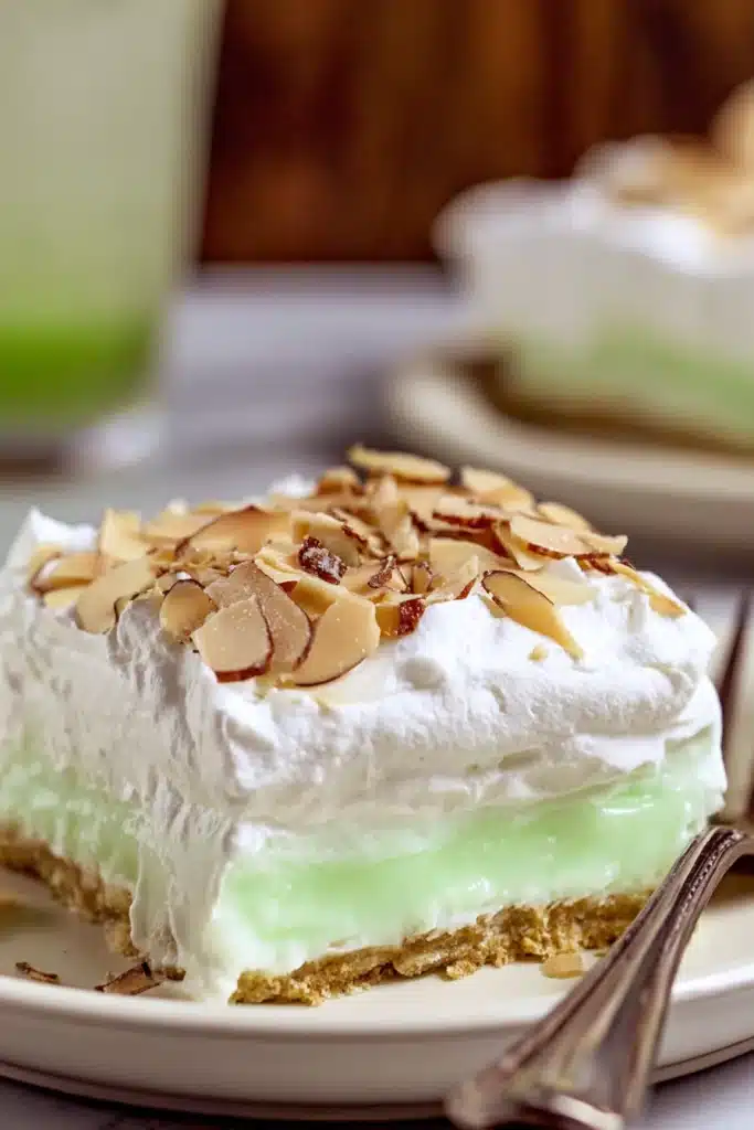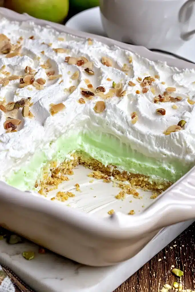 Each layer of Pistachio Lush adds something special. The crust feels firm and buttery. Meanwhile, the cream cheese layer tastes rich and fluffy. Then the pudding layer stays smooth and cool, especially when chilled well.