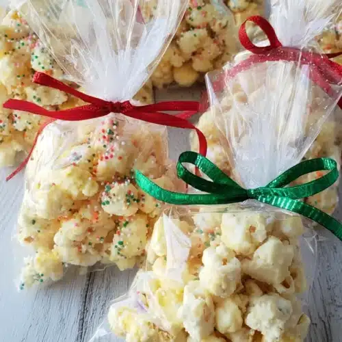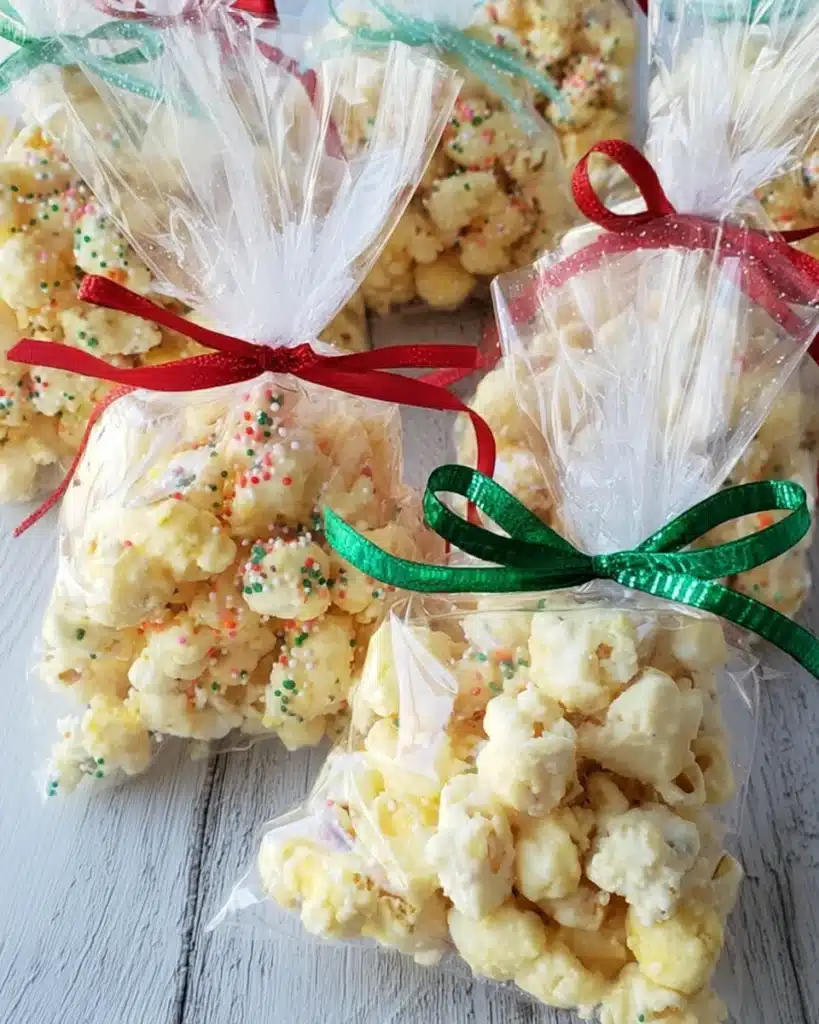 - Spread coated puffcorn on parchment paper and sprinkle with Christmas decorations. Let it set for 1–2 hours until hardened, then break apart and serve or store.