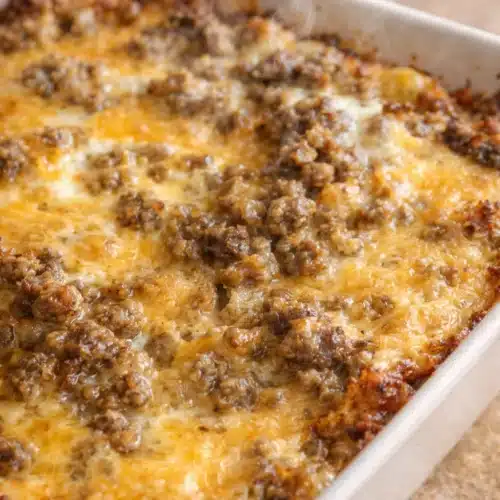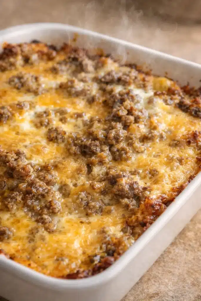 Let the casserole rest for ten minutes after baking. This gives the layers time to settle so your slices come out clean. Then cut into squares and serve warm. The first bite always feels comforting because the cheese stretches slightly while the sausage brings rich flavor.