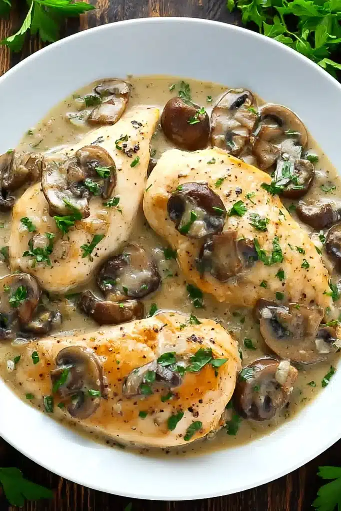 You only need a few simple ingredients to make this dish shine. Boneless, skinless chicken breasts form the base, seasoned with salt and pepper. Garlic and mushrooms add savory depth, while sweet Marsala wine gives the sauce its signature flavor. Cornstarch thickens everything to a silky finish. Finally, a sprinkle of fresh parsley adds color and a touch of freshness at the end.