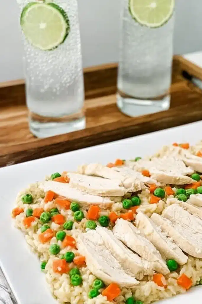 Stir in frozen peas, carrots, and shredded mozzarella. Slice the cooked chicken and place it back over the rice mixture. Cover and cook for another 15โ€“20 minutes until everything is hot, the cheese melts, and the veggies are tender. Each serving has about 248 calories, 21 grams of protein, and a balanced mix of carbs and fats. Serve it hot and enjoy the creamy, savory goodness.