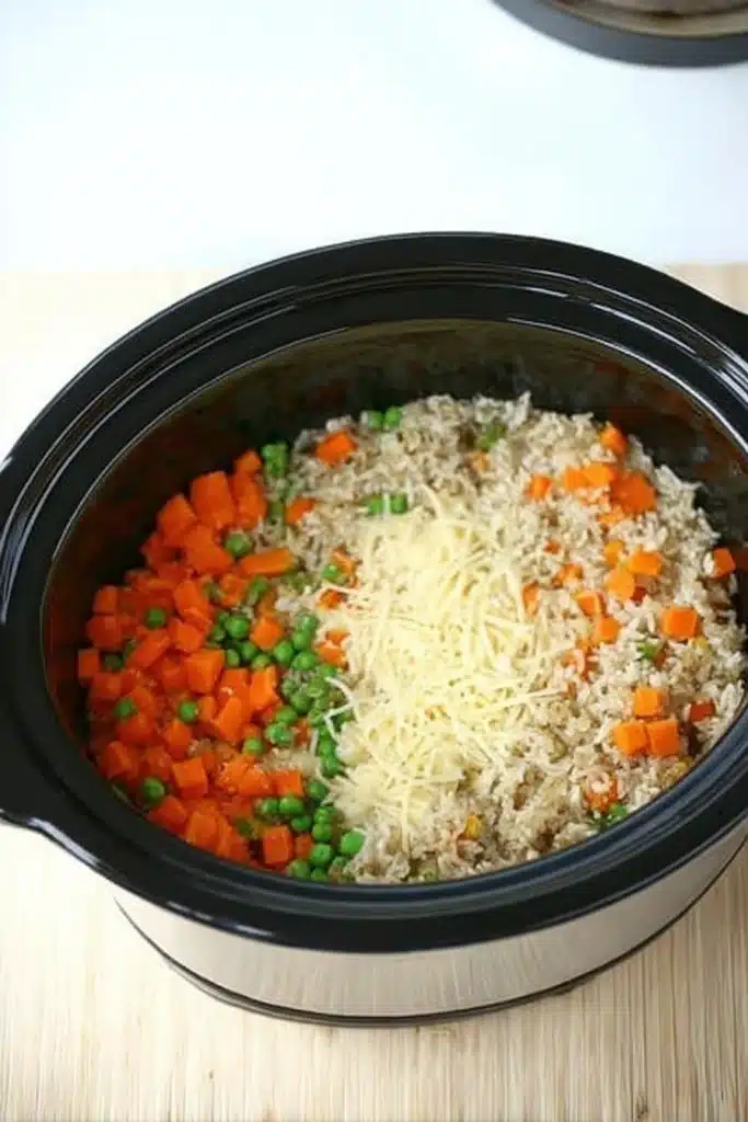Slow cooker chicken and rice with peas, carrots, and melted cheese