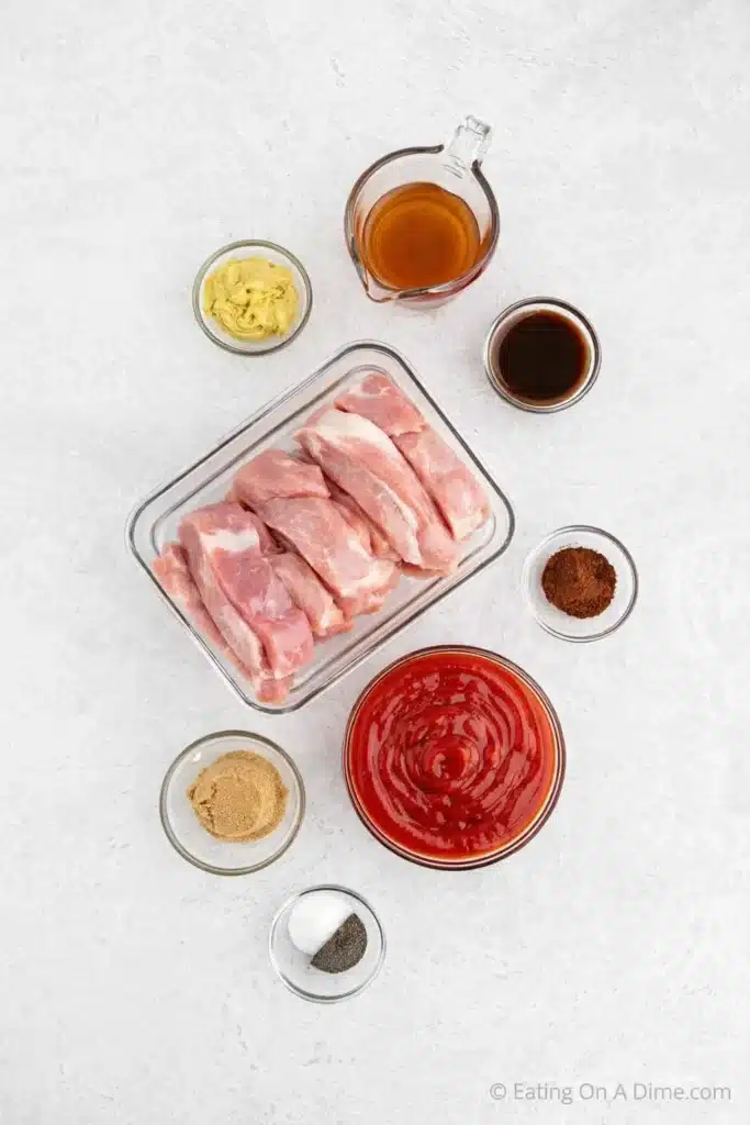 - Country-style pork ribs, brown sugar, chili powder, salt, black pepper, ketchup, apple cider vinegar, spicy brown mustard, and Worcestershire sauce.