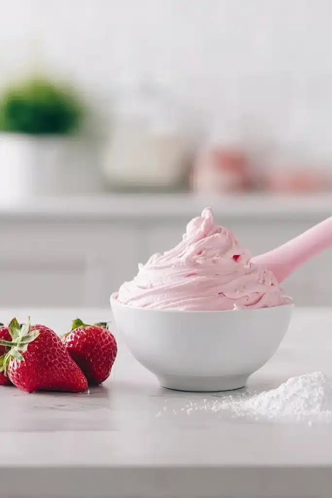 Butter forms the creamy base, while powdered sugar adds body and sweetness. Strawberry puree gives both flavor and pink hue. Vanilla enhances aroma, and a pinch of salt rounds out the sweetness. Heavy cream or milk helps adjust consistency for smooth spreading. When whipped well, it becomes airy, glossy, and ideal for layering.