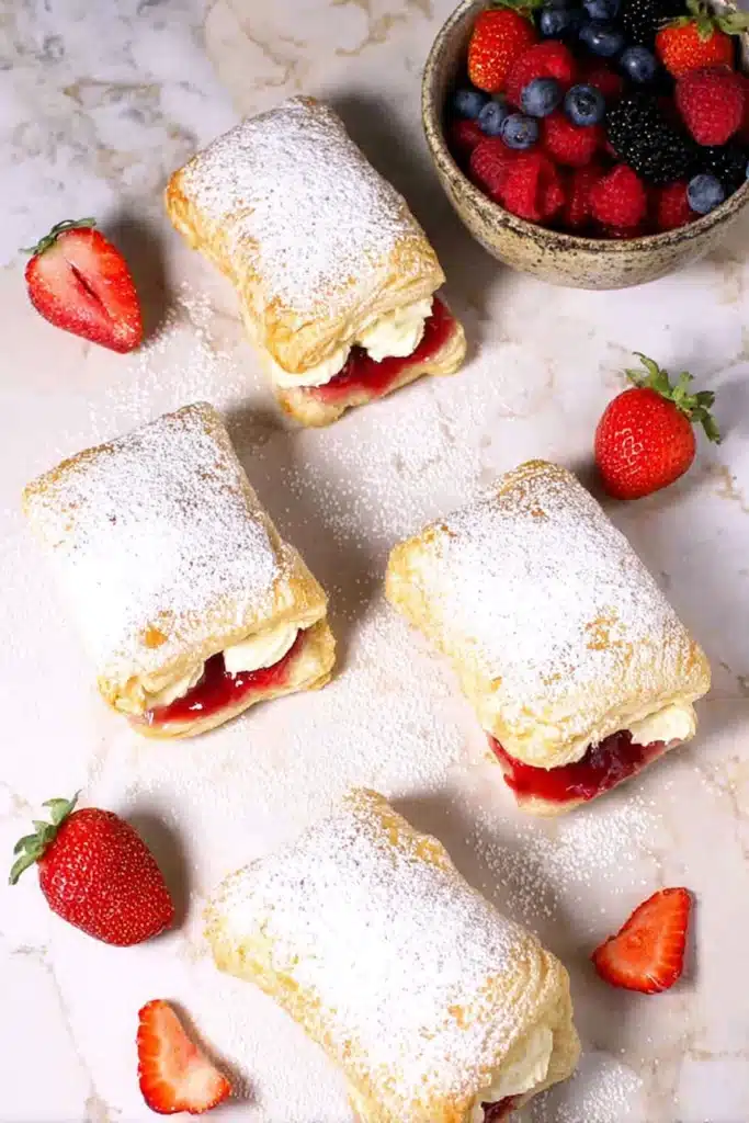 First, you only need simple ingredients like puff pastry, cream cheese, strawberries, sugar, and lemon juice. Then, you bake, whip, and layer. As a result, you get a dessert that feels special without extra stress.