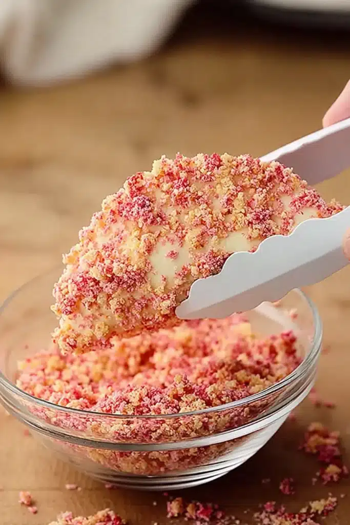 It’s a crumbly topping made from crushed cookies or cereal mixed with strawberry flavoring, often used to coat ice cream bars or desserts.