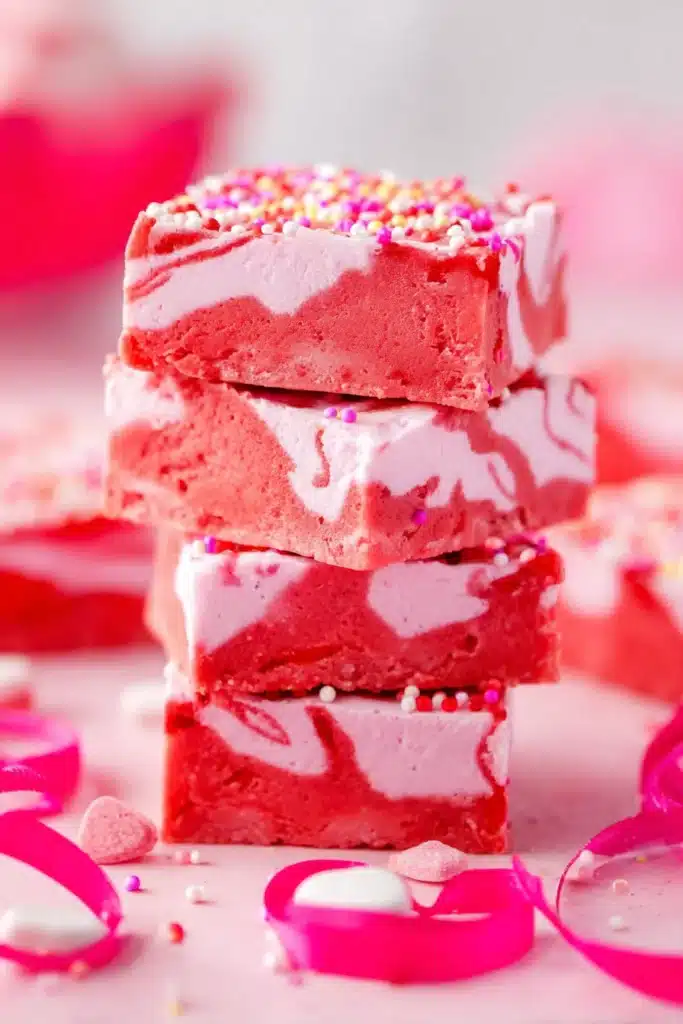 Valentine strawberry fudge with pink and red swirls topped with sprinkles