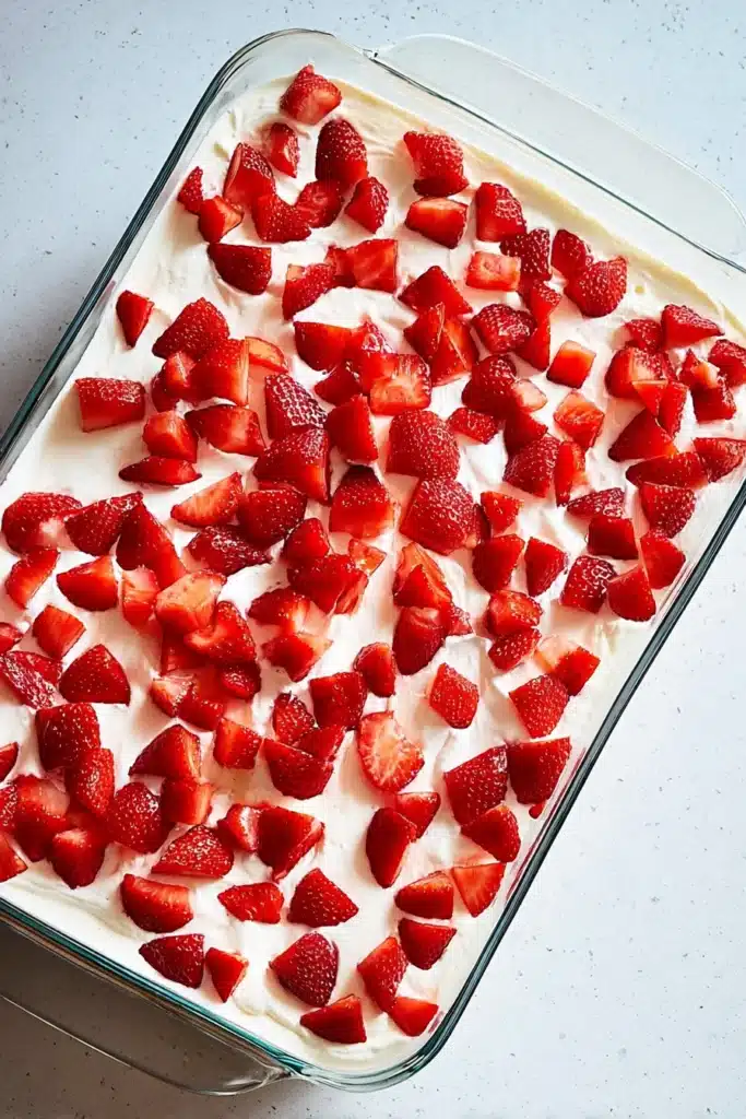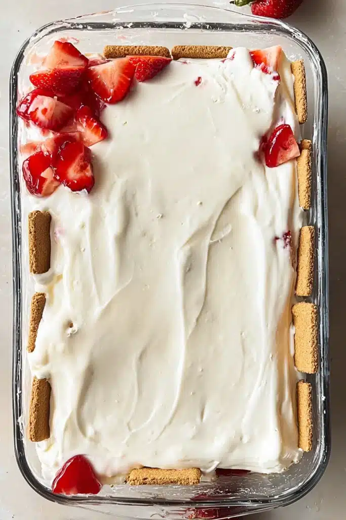 Begin with a layer of graham crackers in a 9ร13-inch pan. Spread one-third of the filling evenly over them, then scatter a handful of diced strawberries. Repeat with another layer of crackers, more filling, and more berries. Finish with a final cracker layer and the rest of the creamy pudding mixture. Top it with the remaining strawberries for a beautiful finish.