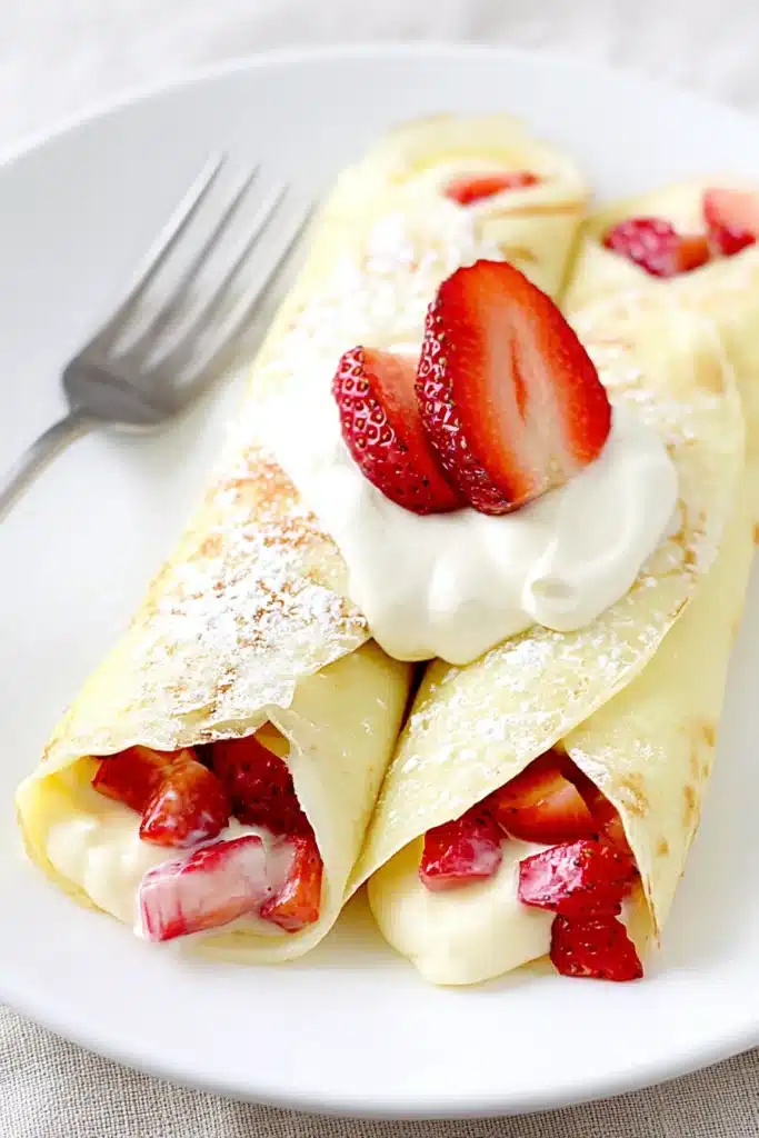 You can switch up the fruit and cream! Try blueberries, raspberries, or even peaches with vanilla cream. For extra indulgence, drizzle melted white chocolate or strawberry sauce on top. These crepes also pair beautifully with your favorite coffee or as part of a larger brunch spread. You can even use a crepe mix breakfast shortcut if youโre short on time.
