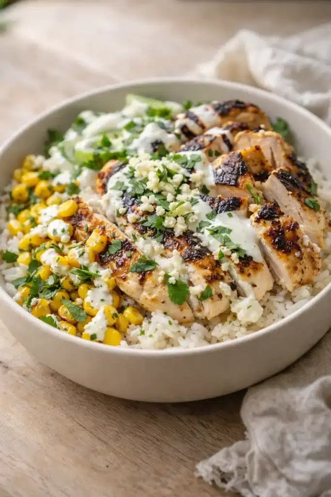 This Street Corn Chicken Rice Bowl delivers smoky chicken, sweet corn, creamy sauce, and bright lime in every bite. It comes together quickly, uses simple ingredients, and fits busy weeknights perfectly. Try it once, then make it your own with extra toppings or spice.