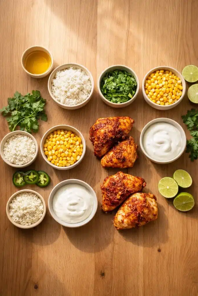 Jasmine rice serves as the soft and fluffy base of your Street Corn Chicken Rice Bowl. It has a light, slightly floral aroma and a tender texture that absorbs flavor beautifully. When you cook it in chicken broth instead of water, it takes on a richer, savory depth from the very beginning. The grains stay separate yet soft, creating the perfect foundation for all the bold toppings.