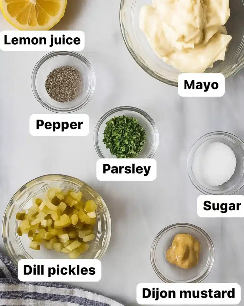 The classic version includes mayonnaise, chopped dill pickles, lemon juice, mustard, sugar, parsley, and black pepper.