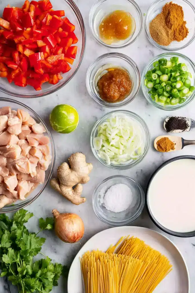 This soup uses pantry-friendly ingredients you may already have. Youโ€™ll need chicken breast, coconut milk, rice noodles, and red curry paste. The combination creates a silky broth thatโ€™s creamy yet not heavy. For seasoning, fish sauce adds depth, while brown sugar balances the spice. Fresh lime juice, basil, and cilantro brighten everything at the end. If you canโ€™t find fish sauce, use soy sauce insteadโ€”itโ€™s a bit different but still tasty. For a vegetarian twist, skip the chicken and add tofu or chickpeas. You can also use light coconut milk to reduce calories while keeping the creaminess.