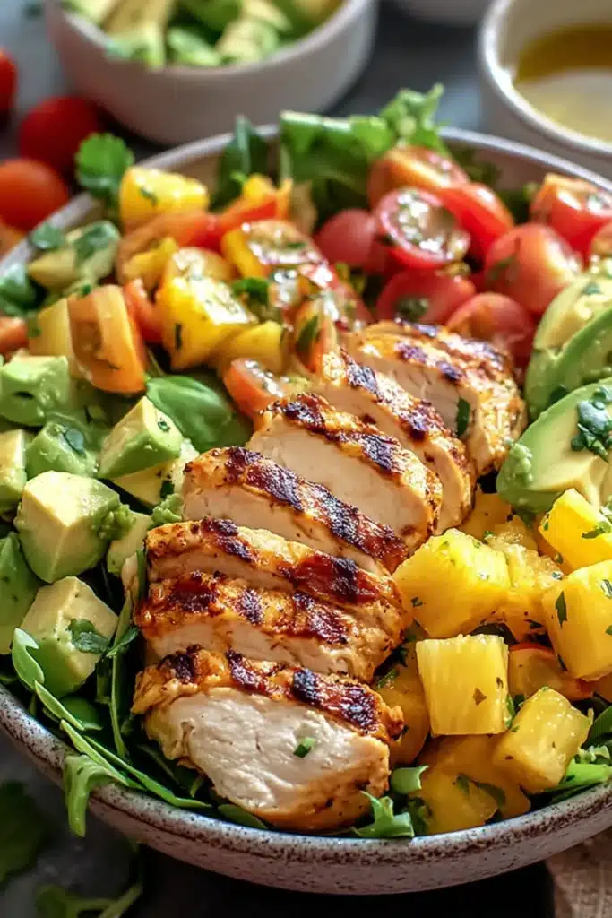 This salad feels like a mini vacation in a bowl. It’s packed with tropical flavors — juicy pineapple, tender chicken, and creamy avocado — all balanced with a light lime-cilantro dressing. You’ll love the mix of textures too: crisp romaine, soft quinoa, and caramelized pineapple edges that taste almost like candy.