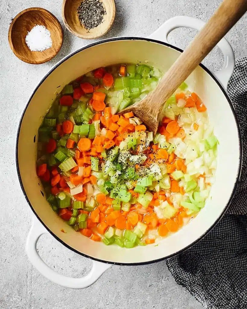 Start by heating olive oil in a large pot over medium heat. Add carrots, celery, and onion, then cook for about 4–5 minutes, stirring often. The goal is to soften them slightly while bringing out their natural sweetness. Add minced garlic, salt, and pepper, then cook for one more minute until the garlic becomes aromatic.