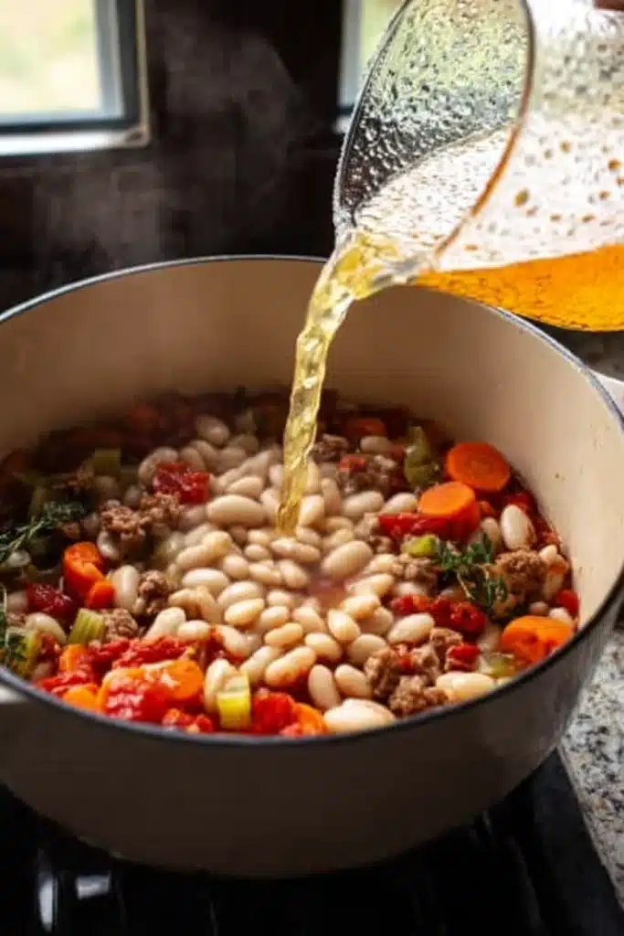Pouring chicken broth over beans and sausage for Tuscan white bean soup