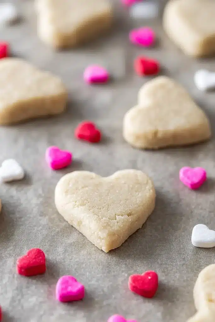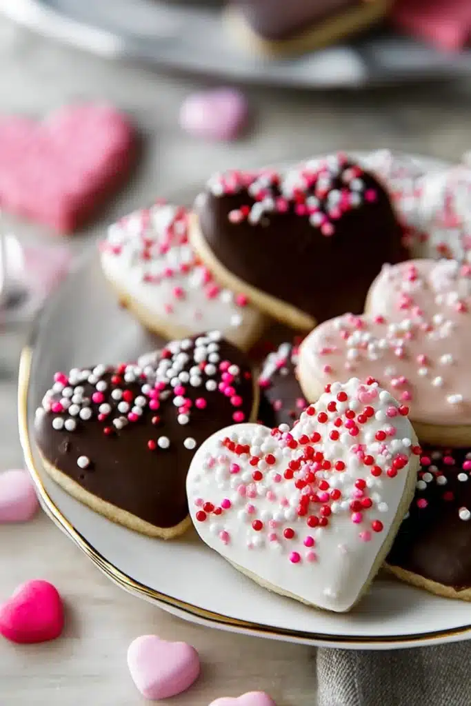 These cookies are buttery, crisp on the edges, and tender in the center. Their mild sweetness balances beautifully with the rich, glossy chocolate coating. The sprinkles add a light crunch and give each cookie a fun, colorful Valentine’s Day vibe.
