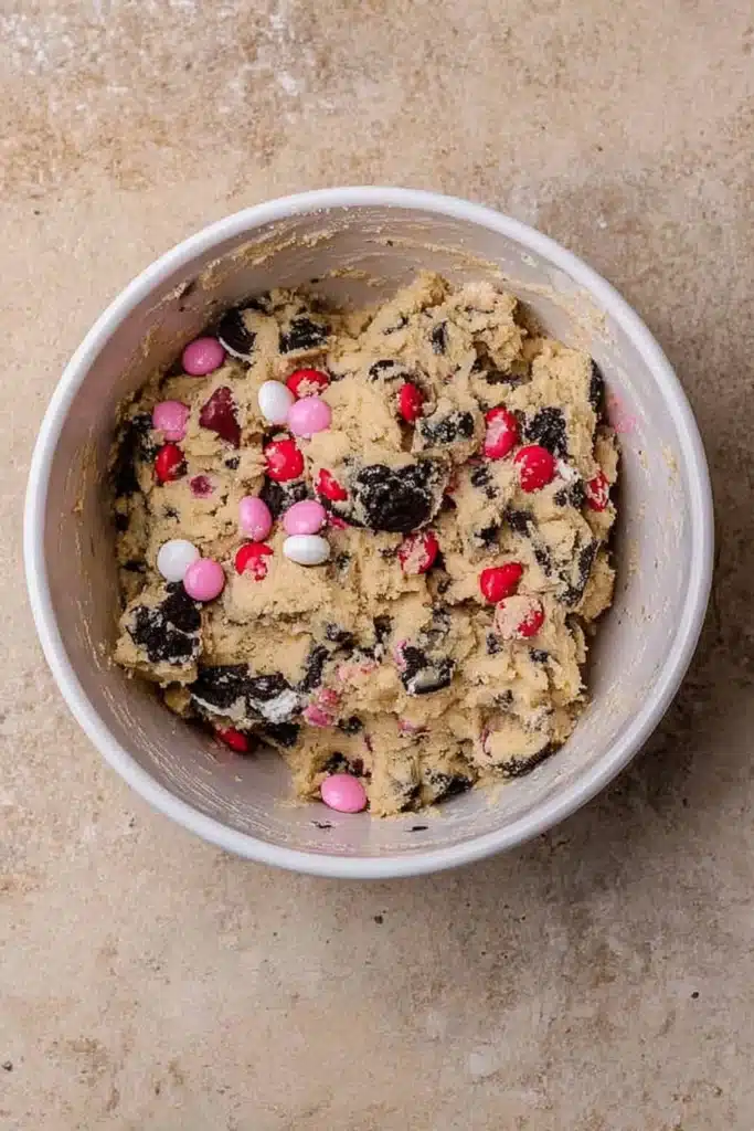 Carefully fold in chopped Oreos and Valentine’s mms. Mix just until evenly distributed, keeping the dough thick and soft. Save a few candies and cookie chunks for topping.